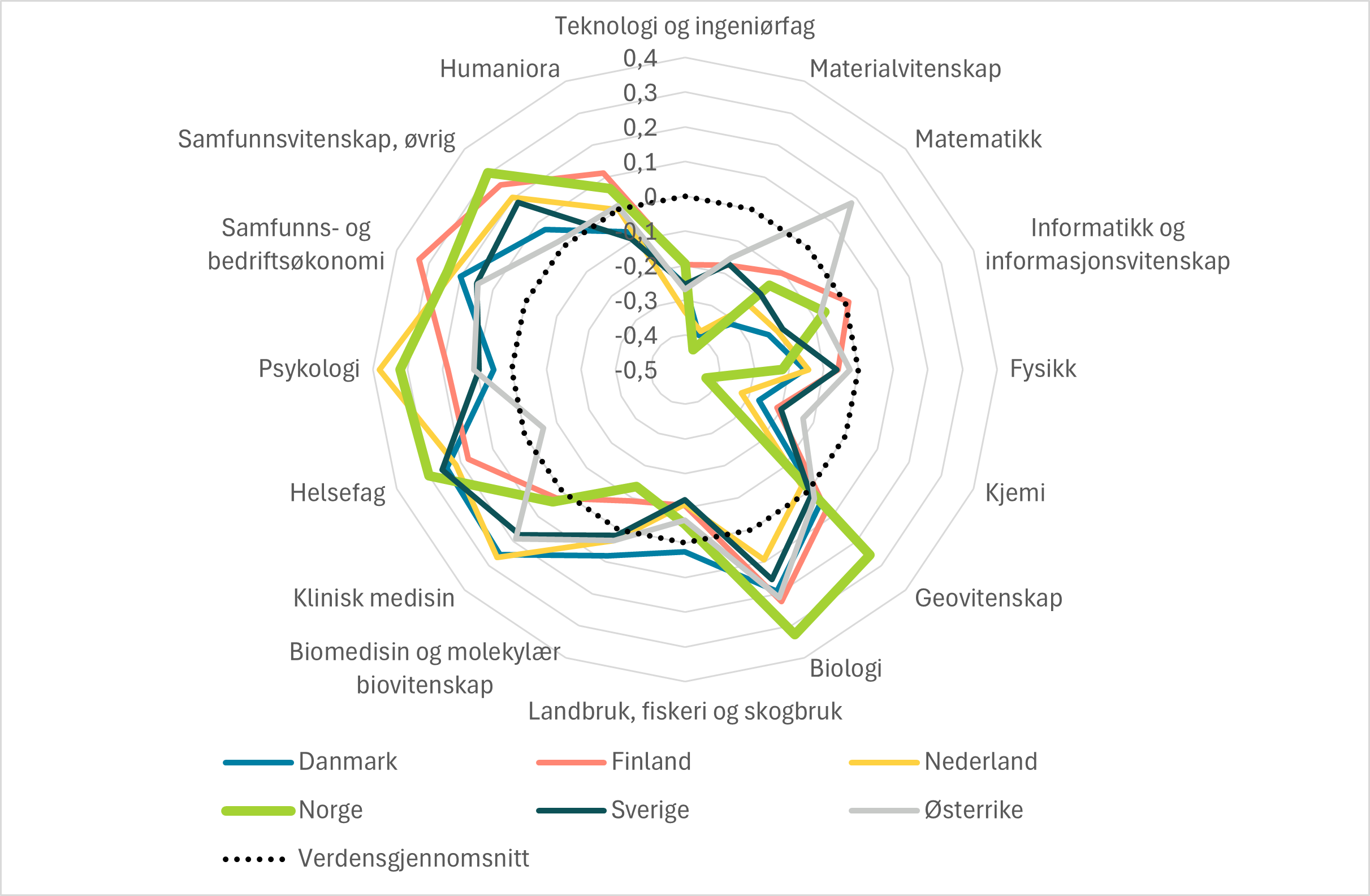 Indikatoren som er benyttet, er den såkalte «relative spesialiseringsindeksen» (se faktaboks), som er et uttrykk for om et land har en høyere eller lavere andel av publikasjonene i et bestemt fagfelt i forhold til hva som er gjennomsnittet for hele verden, normalisert til 0,00.